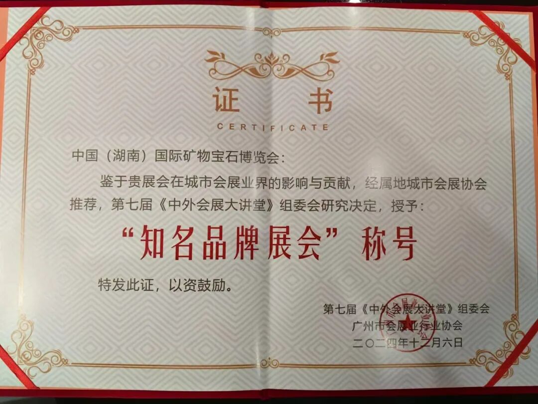 其中,本次大會舉行了“會展人之夜”晚會暨協(xié)會20周年頒獎典禮,中國(湖南)國際礦物寶石博覽會榮獲“知名品牌展會”稱號,郴州榮獲“合作貢獻(xiàn)獎”金獎稱號。