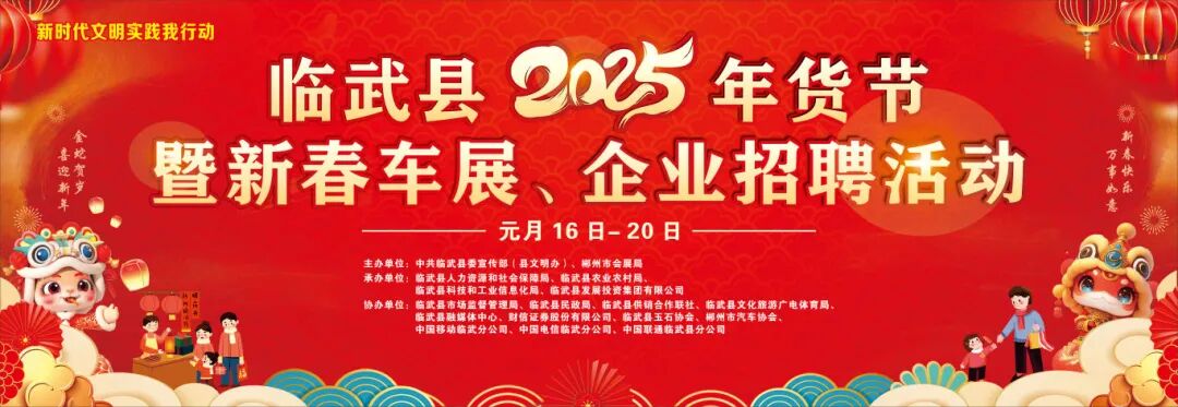 為弘揚(yáng)春節(jié)傳統(tǒng)文化,豐富群眾春節(jié)文化生活,進(jìn)一步提振消費(fèi)信心、釋放消費(fèi)潛力、拉動(dòng)內(nèi)需市場,促進(jìn)返鄉(xiāng)創(chuàng)業(yè)就業(yè),由中共臨武縣委宣傳部(縣文明辦)和郴州市會(huì)展局主辦,臨武縣人力資源和社會(huì)保障局、臨武縣農(nóng)業(yè)農(nóng)村局、臨武縣科技和工業(yè)信息化局、臨武縣發(fā)展投資集團(tuán)有限公司承辦,將于 2025 年 1 月 16 日 - 20 日在臨武縣微電影城新時(shí)代文化廣場舉行臨武縣 2025 年年貨節(jié)暨新春車展、企業(yè)招聘活動(dòng)。本次展會(huì)分年貨展銷、新春車展和企業(yè)招聘三大區(qū)域,現(xiàn)場還設(shè)有幸運(yùn)抽獎(jiǎng)活動(dòng)。
